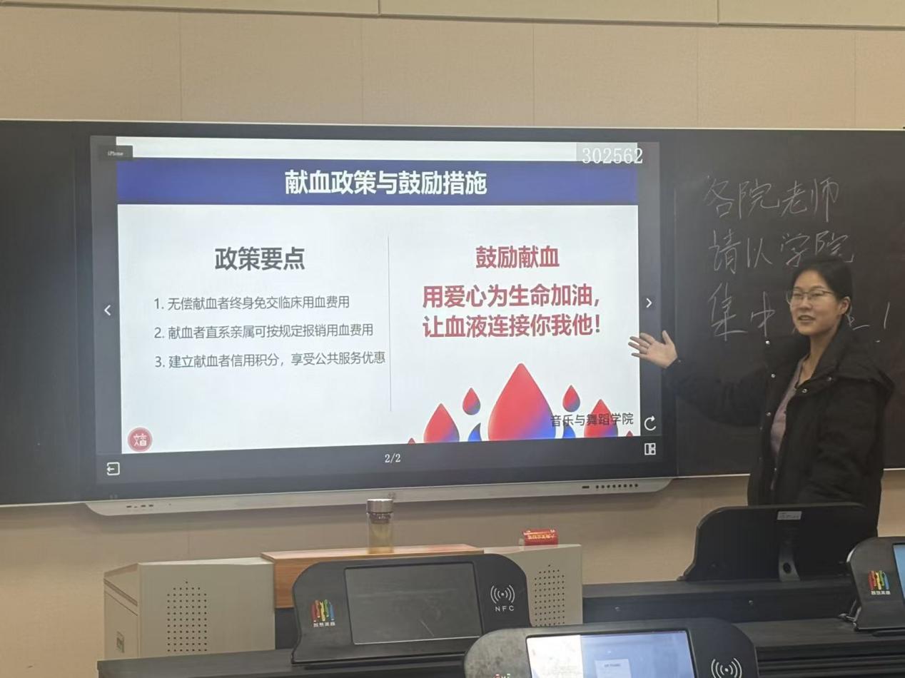 为深入弘扬“奉献、友爱、互助、进步”的志愿精神,引导广大青年学子在实践中践行社会责任、彰显青春担当,12月5日,音乐与舞蹈学院共青团在德艺楼115教室组织召开无偿献血动员大会。我院学生会干部、青马班学员、各团支部团员代表参与了此次动员大会。