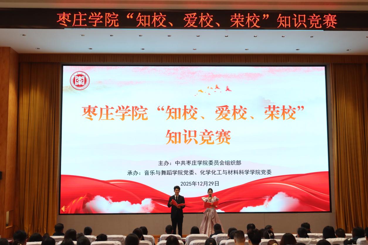 为进一步引导全校师生深入了解校史校情,厚植爱校情怀,凝聚荣校力量,12月29日,由枣庄学院党委组织部主办、音乐与舞蹈学院党委、化学化工与材料科学学院党委承办的枣庄学院“知校、爱校、荣校”知识竞赛决赛在崇德楼报告厅隆重举行。校党委副书记丰雷、校党委委员、纪委书记、监察专员武尚民,校党委委员、组织部部长袁俊现与各职能部门与二级学院的负责人代表以及各学院师生党员紧300人出席活动。